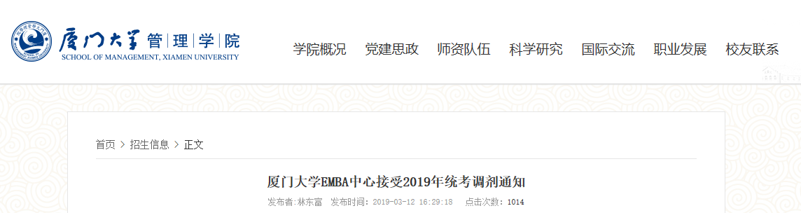 即日起至3月20日,廈門大學EMBA中心接受2019年全國MBA / EMBA考生調劑至我校EMBA項目的申請。