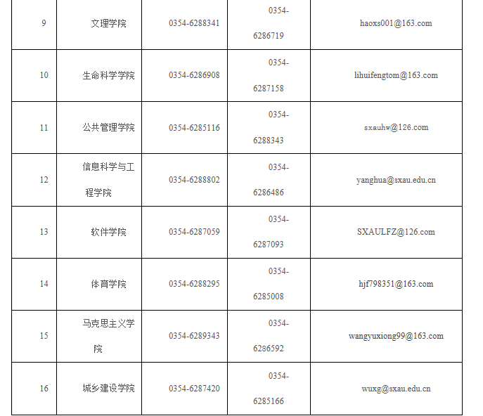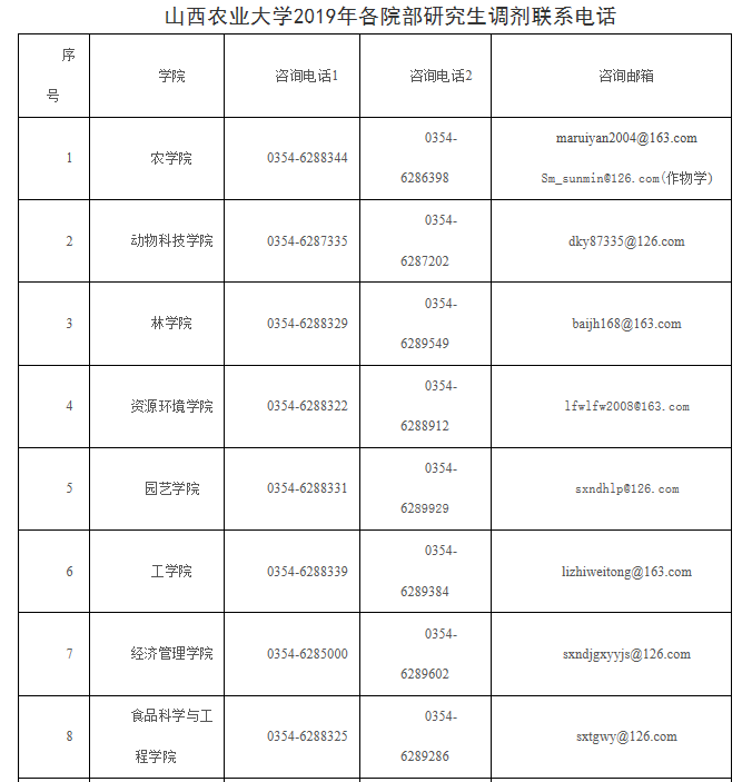1、在教育部調劑系統開通前,考生可從研究生院網站下載中心下載《山西農業大學2019年碩士研究生調劑申請表》,聯系下表中調劑專業所在院部留存調劑資料,正式調劑以調劑系統開通后為準。