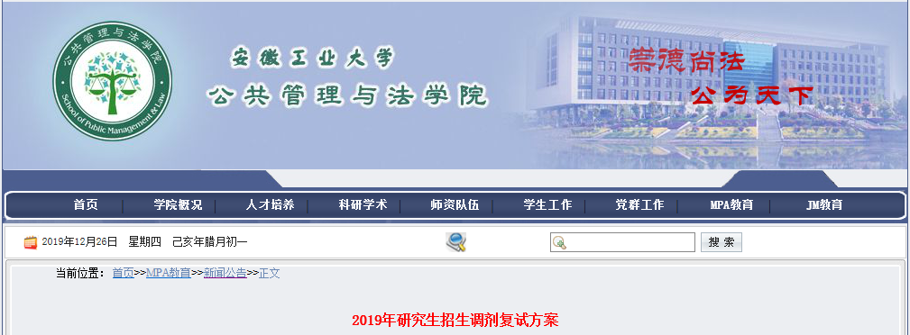 為做好安徽工業(yè)大學(xué)公共經(jīng)濟管理、社會政策與社會法、法律碩士(JM)與公共管理碩士(MPA)學(xué)科2019年碩士研究生招生工作,依據(jù)《安徽工業(yè)大學(xué)2019年碩士研究生招生復(fù)試工作章程》,制定以下調(diào)劑復(fù)試方案。