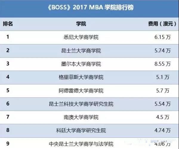 據(jù)《BOSS》雜志2017年工商管理碩士(MBA)排行榜出爐,悉尼大學(xué)商學(xué)院的MBA專(zhuān)業(yè)首次排名澳洲第一。MBA排名情況主要依據(jù)學(xué)業(yè)優(yōu)異和學(xué)生滿意度而定。