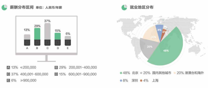 很多同學最關心的薪酬方面,37%的畢業生薪酬在40萬到60萬之間,并且就業地域主要在以北京為主的一線城市。