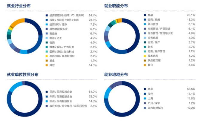 從上圖就業數據可知,私募股權與風險投資依舊是 MBA 同學就業的主要方向,傳統金融機構基金、 證券、信托、資管持續作為同學們的首要選擇,伴隨著信息技術的迭代發展, 金融科技新興業態的就業崗位機會也將被越來越多的同學們所關注。