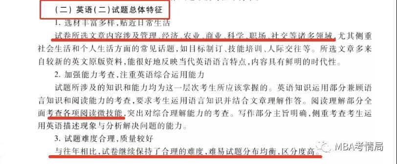 2021年數據樣本英語一和英語二分別抽選了130多萬考生,2021考研英語全國平均分如下: 2021考研英語二抽取了1350118名考生的試卷做了統計分析,統計結果如下: 上表為英語二真題的平均分和難度。2021年的英語真題平均分為50.58分,難度系數為0.506,為近三年最低。 考研英語二各題型平均分對比 注:英語二翻譯15分,小作文10分,大作文15分 上表為換算后的英語二歷年真題各題型的平均分。 21考研英語二“完形“平均分4.41分,和前兩年相比都明顯更難。 “閱讀”A節平均分20.12分,B節“新題型”平均分5.34分,比前兩年都略難。C節“翻譯”平均分7.905分,難度與19年持平,比20考研明顯更難。 寫作部分整體穩定。A節”小作文“平均分5.26分,比前兩年都要更容易。B節“大作文”平均分7.56分,比19年和18年更簡單,但比20年更難。 總體特征 1.選材覆蓋面廣,時代性鮮明 試卷所選文章內容涉及健康﹑商業、環保、文化、法律、科技﹑教育等諸多領域。在關注語言和篇章結構復雜性的同時,注重內容的思想性、知識性和趣味性。文章內容具有普遍性,沒有專業性強的篇章。所選文章多來自較新的英文原版資料,能很好地反映當代英語語言特點,內容具有鮮明的時代性。 2.考查目標明確,聚焦英語綜合運用能力 試題考查目標明確,以英語綜合運用能力為重點。英語知識運用部分兼顧語言知識和閱讀能力的考查,要求考生運用語言知識并結合文章理解作答。閱讀理解部分全面考查各項閱讀微技能,深人考查綜合理解語篇的能力。寫作部分主旨明確、立意深刻,對英語綜合運用能力提出了較高的要求。 3.試題難度合理,質量穩定 試卷結構及題型與往年保持一致,考點分布均衡。試卷總體難度基本合理,過難、過易的試題極少。閱讀材料難度適中,寫作試題難度與往年持平。