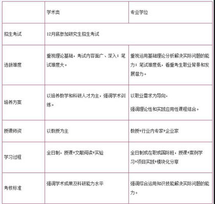 碩士學(xué)位分為兩種:學(xué)術(shù)型學(xué)位和專業(yè)型學(xué)位,MBA屬于專業(yè)型學(xué)位。我們可以將學(xué)術(shù)類和專業(yè)學(xué)位進(jìn)行以下分析: