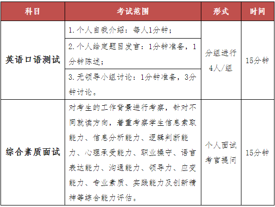 英語口語,測試時間為3~5分鐘(與綜合素質測評同一環節進行);