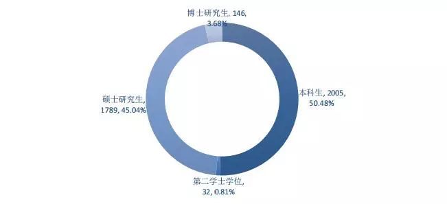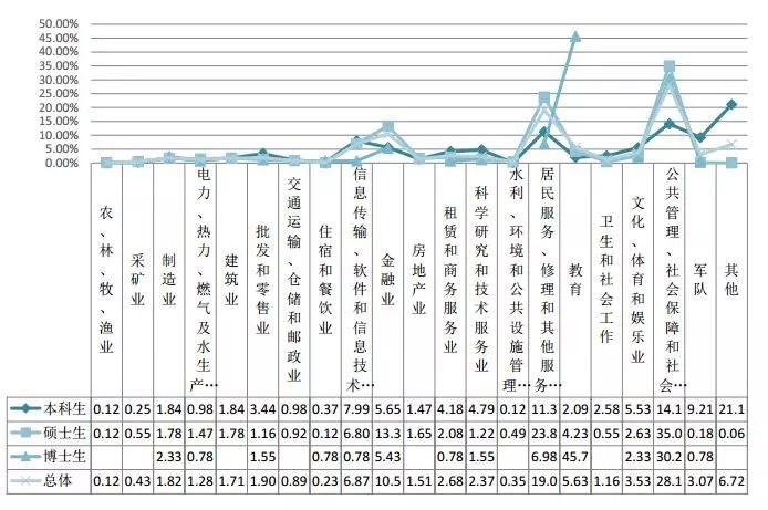 從學歷層次看,本科生最主要落實的就業行業依次為公共管理、社會保障和社會組織(14.13%)、居民服務、修理和其他服務業(11.30%)、軍隊(9.21%)。 碩士生最主要落實的就業行業依次為公共管理、社會保障和社會組織(35.03%)、居民服務、修理和其他服務業(23.82%)、金融業(13.35%)。博士生最主要落實的就業行業依次為教育(45.74%)、公共管理、社會保障和社會組織(30.23%)、居民服務、修理和其他服務業(6.98%)。