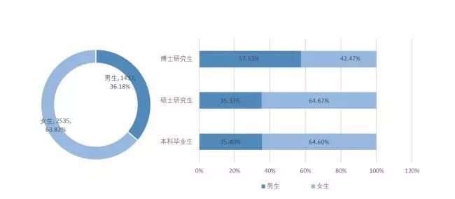 畢業生中男生共有1437人(其中本科生721人,碩士研究生632人,博士研究生84人);女生共2535人(其中本科生1316人,碩士研究生1157人,博士研究生62人)。