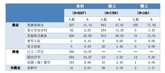 本科畢業生、碩士畢業生、博士畢業生的就業落實率分別為 97.99%、97.21%、98.63%,具體來看,簽就業協議的畢業生中,博士生比例最高;國內升學和出國(境)留學的畢業生中,本科生比例最高。
