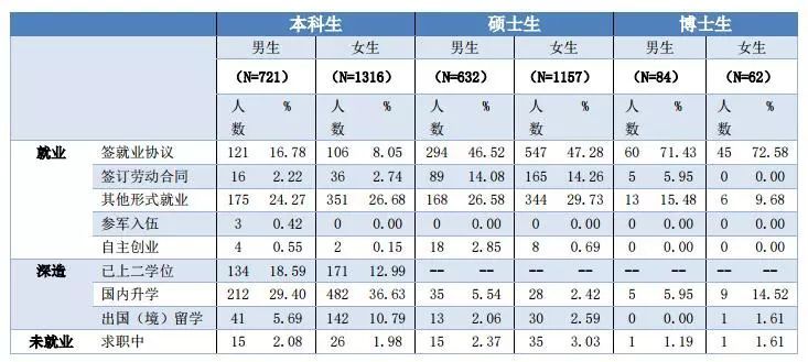 從本科畢業生的數據來看,男生、女生的就業落實率分別為97.92%和98.02%,基本持平。具體來看,男生簽就業協議和自主創業的比例高于女生,而國內升學和出國(境)留學的比例低于女生。