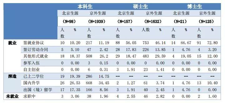 北京生源畢業生共有276人(其中本科生98人,碩士研究生157人,博士研究生21人);京外生源畢業生共有3696人(其中本科生1939人,碩士研究生1632人,博士研究生125人)。
