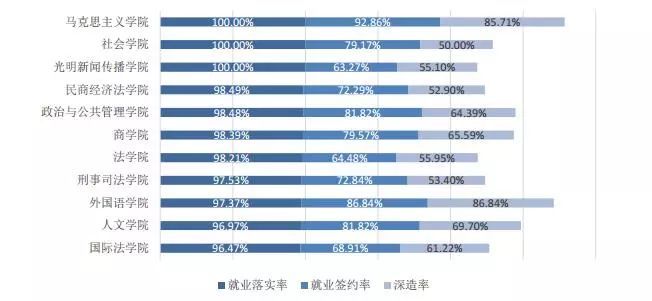 數據顯示,本科畢業生中,馬克思主義學院、社會學院和光明新聞傳播學院3個學院的就業落實率最高,為100.00%,民商經濟法學院、政治與公共管理學院、商學院和法學院高于學校平均水平。