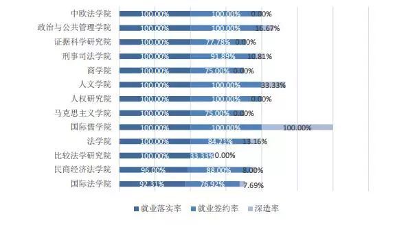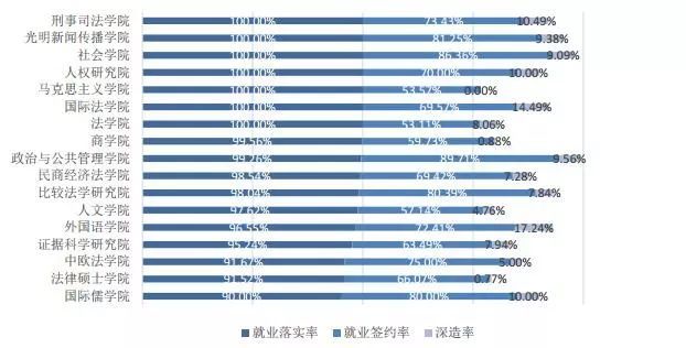 碩士畢業生中,刑事司法學院、光明新聞傳播學院、社會學院、人權研究院、馬克思主義學院、國際法學院、法學院7個學院的就業落實率最高,為100.00%,商學院、政治與公共管理學院、民商經濟法學院、比較法學研究院和人文學院高于學校平均水平。