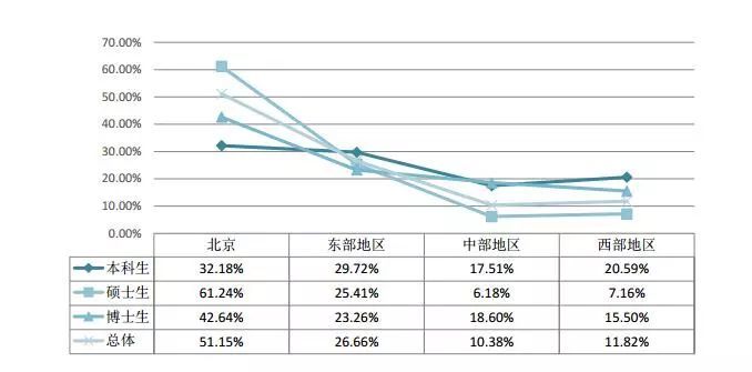 具體從學歷層次來看,32.18%的本科生選擇在北京就業,其次選擇在東部地區(29.72%)。61.24%的碩士生選擇在北京就業,其次選擇在東部地區(25.41%)。42.64%的博士生選擇在北京就業,其次選擇在東部地區(23.26%)。