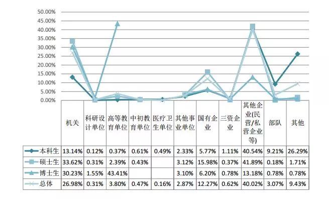 從學歷層次看,本科生最主要落實的單位類型依次為其他企業(民營/私營企業等)(40.54%)、機關(13.14%)、部隊(9.21%)。 碩士生最主要落實的單位類型依次為其他企業(民營/私營企業等)(41.89%)、機關(33.62%)、國有企業(15.98%)。 博士生生最主要落實的單位類型依次為高等教育單位(43.41%)、機關(30.23%)、其他企業(民營/私營企業等)(13.18%)。