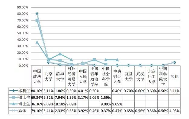 從本科畢業生的數據來看,國內升學人數共999人,占比49.04%。畢業生升學所選高校主要集中在中國政法大學(80.16%)、北京大學(5.11%)、中國人民大學(4.01%)。