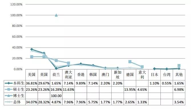 從本科畢業生的數據來看,出國(境)留學人數為183人,占比8.98%。畢業生留學首選目標國家(地區)主要依次為美國(36.81%)、英國(29.67%)、香港(9.89%)。