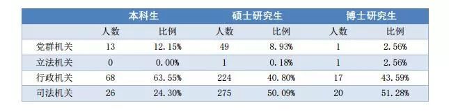 共695人到黨政機關工作(本科畢業生107人,碩士研究生549人,博士研究生39人),其中63人選擇到黨群機關工作,占所有到黨政機關的畢業生總數的9.06%(其中本科畢業生13人,碩士研究生49人,博士研究生1人),2人到立法機關工作(其中碩士研究生1人,博士研究生1人),有309人到行政機關工作,占44.46%(其中本科畢業生68人,碩士研究生224人,博士研究生17人);到司法機關工作的畢業生共321人,占46.19%(其中本科畢業生26人,碩士研究生275人,博士研究生20人)。