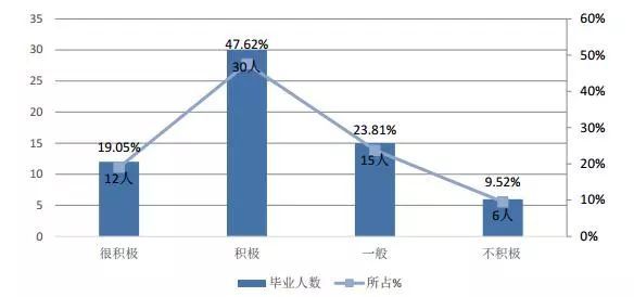 用人單位對本校畢業生在求職過程中表現的積極程度評價均值為3.76,相當于百分制的75.24 分。其中,認為本校畢業生“很積極”或“積極”的單位占66.67%,認為本校畢業生“不積極”的占9.52%。