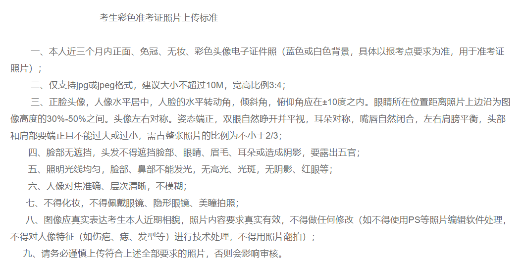 圖像應(yīng)真實表達考生本人近期相貌,照片內(nèi)容要求真實有效,不得做任何修改(如不得使用PS等照片編輯軟件處理,不得對人像特征(如傷疤、痣、發(fā)型等)進行技術(shù)處理,不得用照片翻拍);