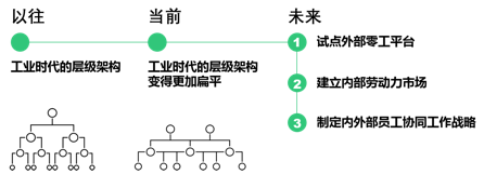 與傳統(tǒng)企業(yè)自工業(yè)時(shí)代以來一直依賴的陳舊等級(jí)管理模式相比,數(shù)字領(lǐng)軍企業(yè)能夠輕松利用技術(shù)更迅速地彌合人才缺口、啟動(dòng)新項(xiàng)目,并能更加及時(shí)地應(yīng)對(duì)市場(chǎng)變化。對(duì)于大型傳統(tǒng)企業(yè)來說,嘗試使用新興柔性勞動(dòng)力派遣平臺(tái),無需即刻就對(duì)現(xiàn)有管理模式作出重大調(diào)整,卻可以隨著時(shí)間的推移逐步發(fā)揮“鲇魚效應(yīng)”,通過柔性團(tuán)隊(duì)的使用來推動(dòng)革新、積累技能、建立人才檔案。自然而然地,借助外部力量,企業(yè)內(nèi)部員工團(tuán)隊(duì)也將從按崗招聘、業(yè)務(wù)職能固化的傳統(tǒng)用工方式中脫離出來,實(shí)現(xiàn)更多自我價(jià)值,也為企業(yè)創(chuàng)造更多價(jià)值。
