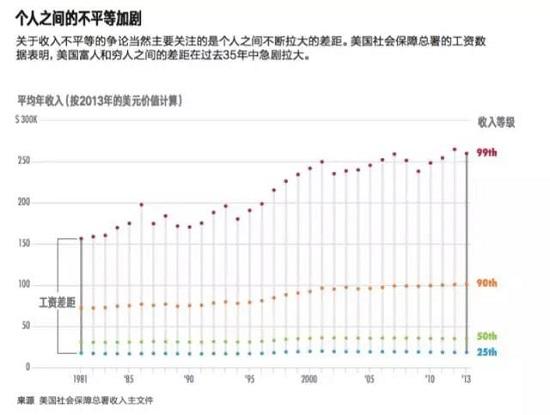 1980年以來,多數經濟體的收入不平等問題急劇惡化,美國尤為嚴重。大多數公眾討論都集中在最富有的1%人群與其他人之間的差距上。1980年,美國收入最高的1%成年人平均稅前年收入高達42萬美元(按2014年的美元價值計算),是平均收入最低的50%成年人的27倍。如今收入最高的1%人群平均年收入為130萬美元,是平均收入最低的50%工人的81倍。