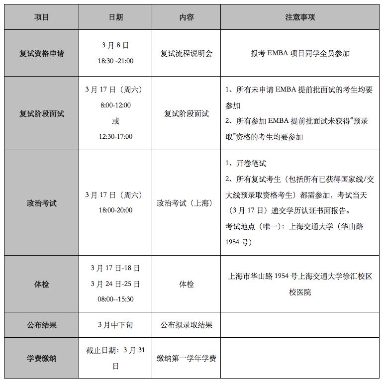 EMBA辦公室自主組織安排錄取復試等工作,復試流程包括:復試面試、政治考試、學歷認證、體檢等。具體安排如下: