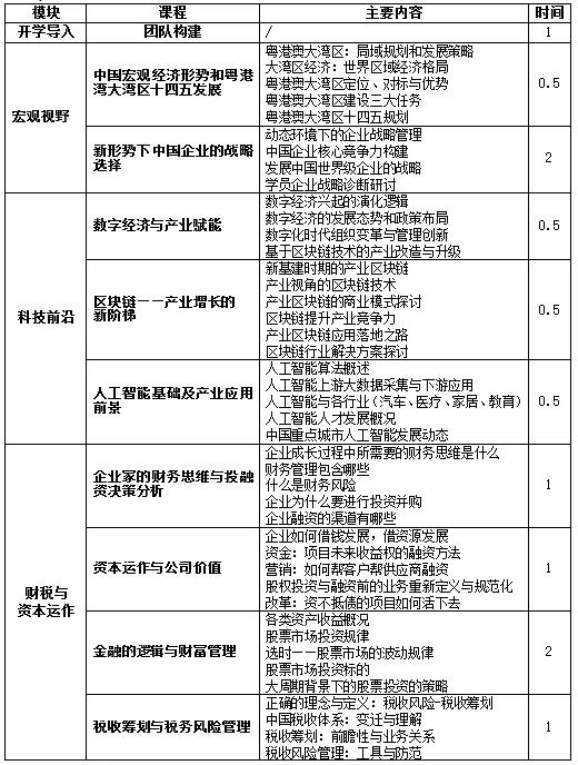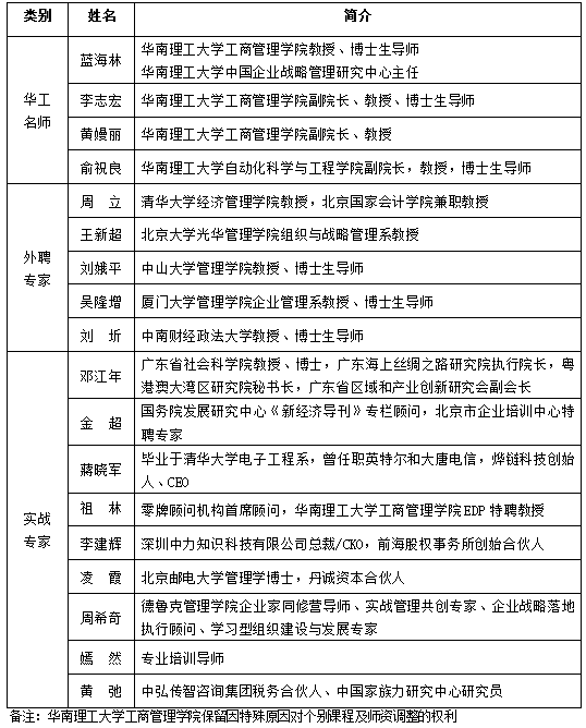 本課程旨在為企業發展提供智力支持,發揮華南理工大學工科優勢,貫徹“名校+名企”戰略。以資深師資團隊為核心,以華南本土企業資源為依托,以構建人才培養生態鏈為宗旨,致力于培養具有戰略眼光和現代企業系統管理知識,具有創新精神和全球視野,引領產業發展的精英企業家和高層管理人員。