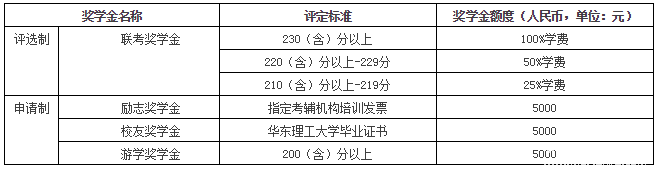 1. MBA(EMBA)聯考獎學金:參加華理2018優選面試獲得優秀檔加分的考生,根據考生2018年管理類聯考總分(綜合與英語二總分,滿分300分),不包括優選面試加分。按照:230(含)分以上、220(含)分以上-229分、210(含)分以上-219分共三檔直接評定;