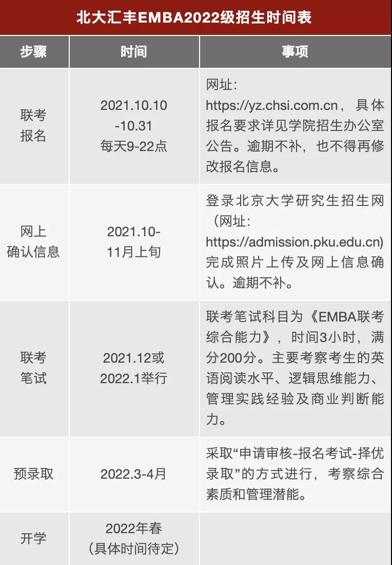 招生簡(jiǎn)章是每年考研er需要關(guān)注的重要官方政策,一般情況下涵蓋了各個(gè)專(zhuān)業(yè)的報(bào)考條件、招生名額、學(xué)費(fèi)、學(xué)制、報(bào)考流程等必要信息,為了幫助大家及時(shí)掌握一手信息,迅速做出報(bào)考應(yīng)對(duì),小編今天為大家?guī)?lái)了“2022EMBA招生簡(jiǎn)章:北京大學(xué)匯豐商學(xué)院2022年高級(jí)工商管理碩士(EMBA)招生簡(jiǎn)章”,希望對(duì)報(bào)考MBA的同學(xué)有所幫助!
