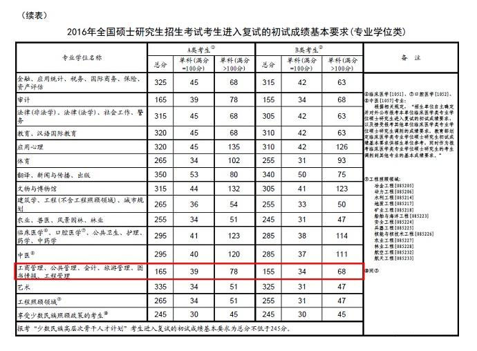 教育部在今日公布《2016年全國碩士研究生招生考試考生進入復試的初試成績基本要求》。工商管理碩士A類院??偡譃?65分 B類院??偡譃?55分,詳情請見下表。