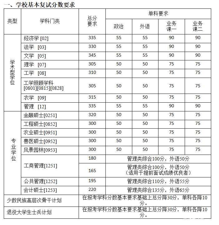 說明:1、上表為我校基本復試分數要求,生源充裕學院可根據整體考試情況、招生計劃、學科專業特點等,上調分數要求,但差額復試比例不得低于120%。報考該類學院的考生須達到學院公布的復試分數要求才能參加復試。學院調整后的復試分數線、復試辦法,由各院近日公布,請密切留意。