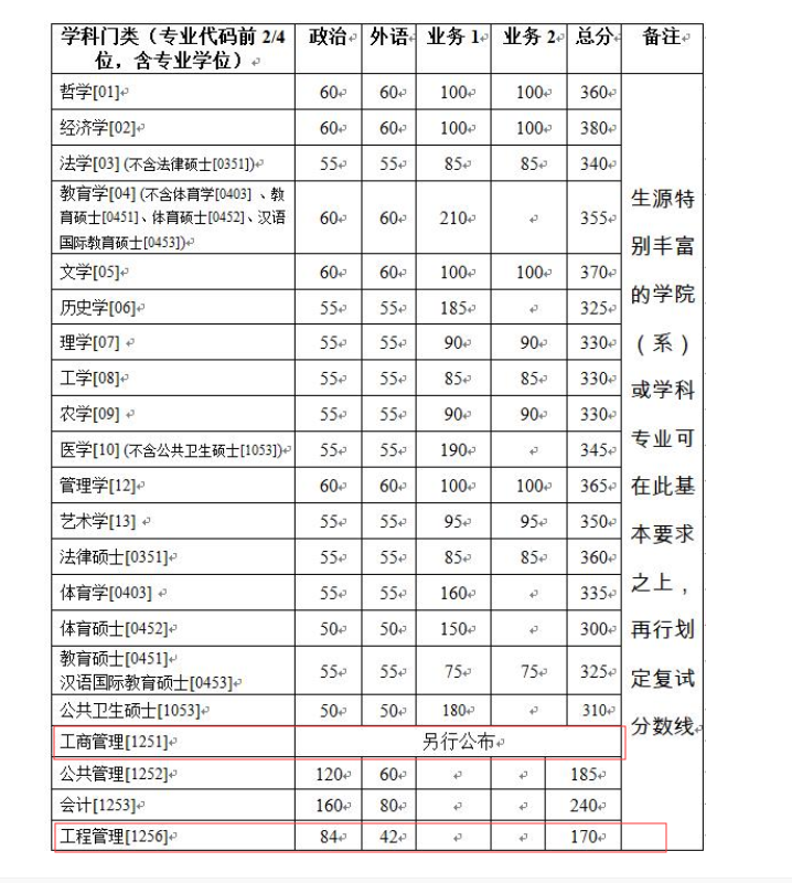 二、上表所列分數線(管理類聯考除外)滿足以下情況視同上線:若單科低1分,總分相應高20分及以上;單科低2分,總分高25分及以上;以此類推,單科每低1分,總分相應再提高5分。但單科不得低于5分(含5分),且僅限1門單科。