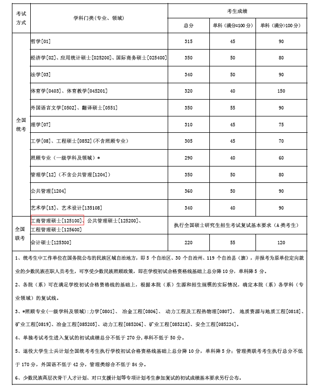 | 1、統(tǒng)考生中工作單位在國(guó)務(wù)院公布的民族區(qū)域自治地方,即5個(gè)自治區(qū)、30個(gè)自治州、119個(gè)自治縣(旗),并報(bào)考為原單位定向就業(yè)的少數(shù)民族在職人員考生,可享受少數(shù)民族照顧政策,即在學(xué)校初試合格資格線基礎(chǔ)上總分降10分,單科降5分。 2、各院(系)可在滿足學(xué)校初試合格資格線的基礎(chǔ)上,根據(jù)本院(系)生源和招生規(guī)模的實(shí)際情況,確定本院(系)各學(xué)科(專業(yè)領(lǐng)域)的復(fù)試線。 3、*照顧專業(yè)(一級(jí)學(xué)科及領(lǐng)域):力學(xué)[0801]、冶金工程[0806]、動(dòng)力工程及工程熱物理[0807]、地質(zhì)資源與地質(zhì)工程[0818]、礦業(yè)工程[0819]、冶金工程[085205]、動(dòng)力工程[085206]、礦業(yè)工程[085218]、安全工程[085224]。 4、工商管理碩士、公共管理碩士考生參加復(fù)試的初試成績(jī)基本要求另行公布。 5、少數(shù)民族高層次骨干人才計(jì)劃、對(duì)口支援計(jì)劃、退役大學(xué)生士兵計(jì)劃等專項(xiàng)計(jì)劃考生參加復(fù)試的初試成績(jī)基本要求另行公布。 6、享受教育部文件中規(guī)定的相關(guān)加分政策考生須將有關(guān)證明材料在3月13日前提交至報(bào)考學(xué)院,逾期不予受理。 |
