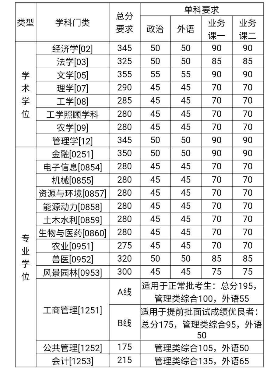 說明:上表為我校基本復試分數要求,生源充裕學院可根據整體考試情況、招生計劃、學科專業特點等,上調分數要求,但差額復試比例一般不得低于120%。報考該類學院的考生須達到學院公布的復試分數要求才能參加復試。
