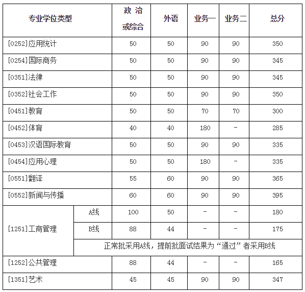 二、學(xué)校復(fù)試基本分?jǐn)?shù)線(專業(yè)學(xué)位類)