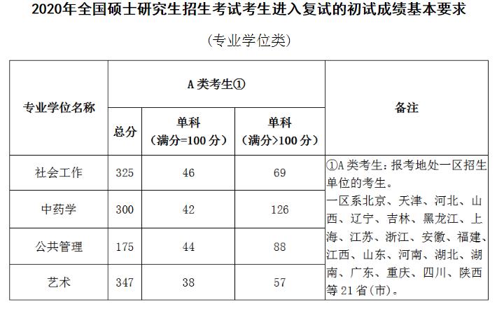 根據(jù)教育部公布的《2020年全國(guó)碩士研究生招生考試考生進(jìn)入復(fù)試的初試成績(jī)基本要求(專業(yè)學(xué)位類)》,我校社會(huì)工作碩士、中藥學(xué)碩士、公共管理碩士及藝術(shù)碩士,均按照此要求中A類考生的總分及單科分?jǐn)?shù)要求劃定復(fù)試名單。報(bào)考同一專業(yè)的全日制學(xué)習(xí)方式考生和非全日制學(xué)習(xí)方式考生分?jǐn)?shù)要求相同。具體分?jǐn)?shù)要求見(jiàn)下表: