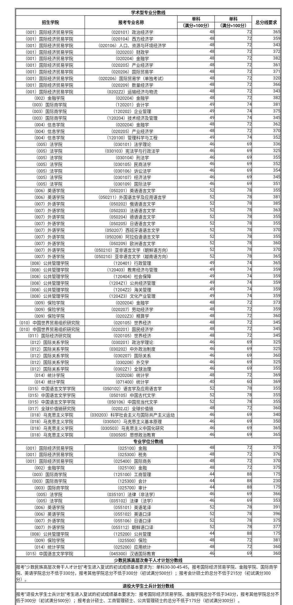 繼2020考研國(guó)家線公布后,34所自主劃線院校也陸續(xù)公布2020年復(fù)試分?jǐn)?shù)線,對(duì)外經(jīng)濟(jì)貿(mào)易大學(xué)已經(jīng)公布2020年碩士研究生入學(xué)考試復(fù)試基本分?jǐn)?shù)線,如下所示: