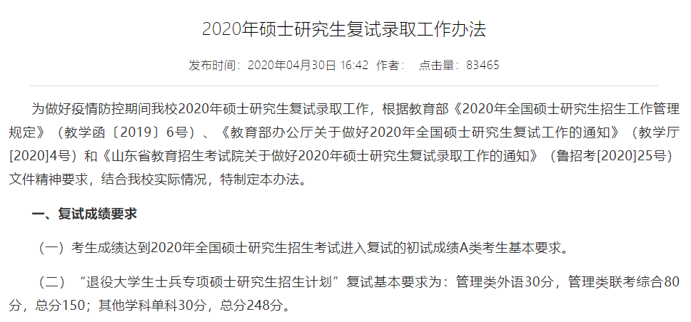 山東師范大學2020年MBA復試基本分數線:175/44/88