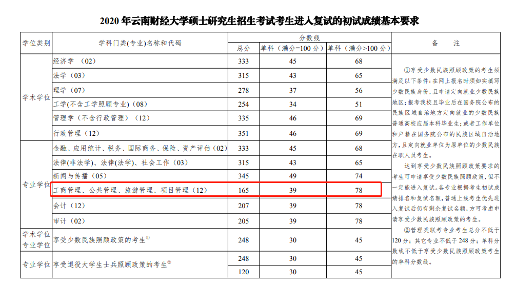 云南財經大學2020年MBA復試基本分數線:165/39/78