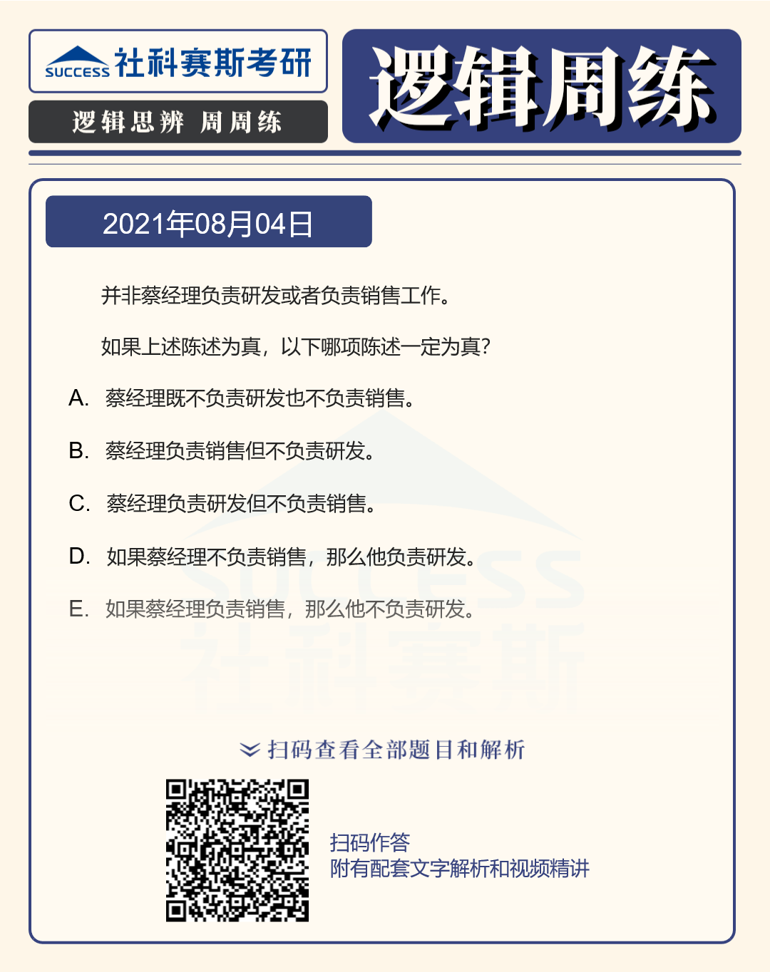 以上就是“2022MBA邏輯:2022MBA聯考邏輯習題及答案解析(8月4日)”的全部內容,更多邏輯精選習題,請持續關注社科賽斯MBA備考網!