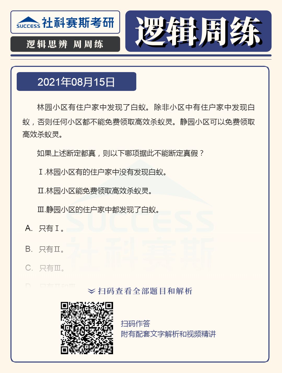 以上就是“2022MBA邏輯:2022MBA聯(lián)考邏輯習(xí)題及答案解析(8月15日)”的全部內(nèi)容,更多邏輯精選習(xí)題,請持續(xù)關(guān)注社科賽斯MBA備考網(wǎng)!