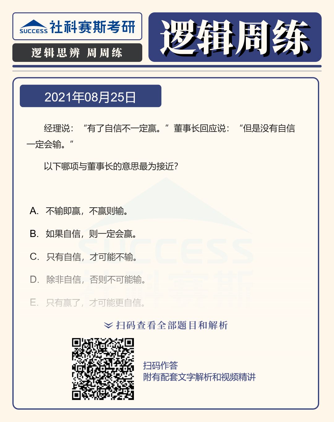 以上就是“2022MBA邏輯:2022MBA聯(lián)考邏輯習(xí)題及答案解析(8月25日)”的全部?jī)?nèi)容,更多邏輯精選習(xí)題,請(qǐng)持續(xù)關(guān)注社科賽斯MBA備考網(wǎng)!