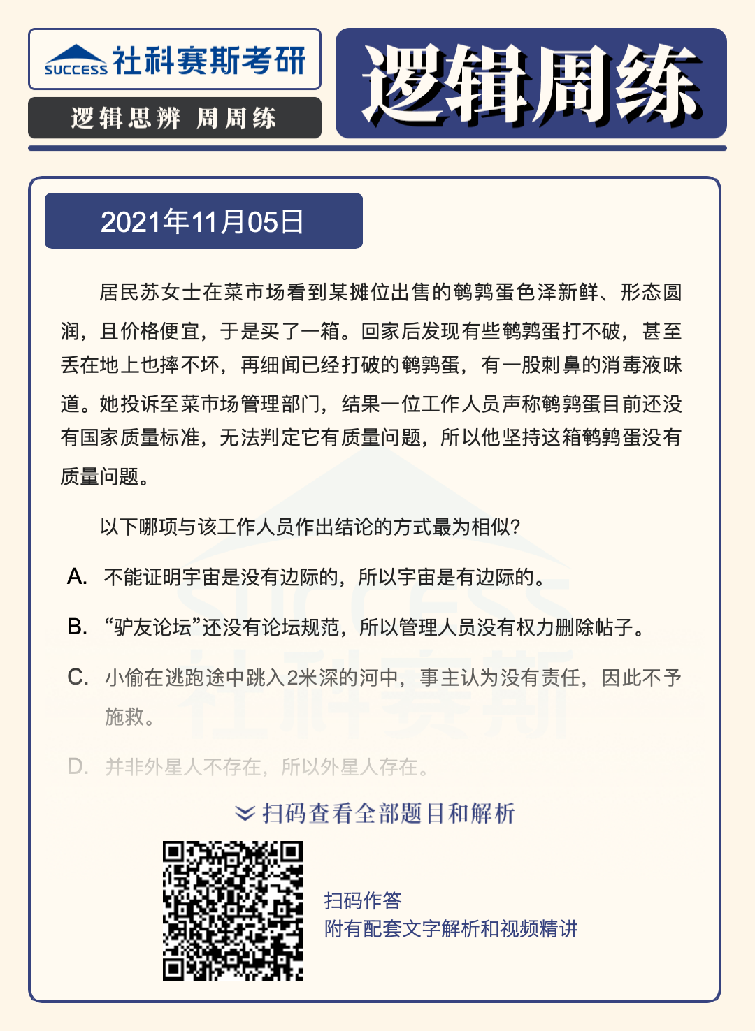 導(dǎo)讀:邏輯題型是管理類聯(lián)考考試中的必考題型,也是MBA聯(lián)考復(fù)習(xí)中的重要部分,社科賽斯MBA備考網(wǎng)小編整理了“2022MBA邏輯:2022MBA聯(lián)考邏輯習(xí)題及答案解析(11月5日)”的內(nèi)容,希望能對廣大考生有所幫助。
