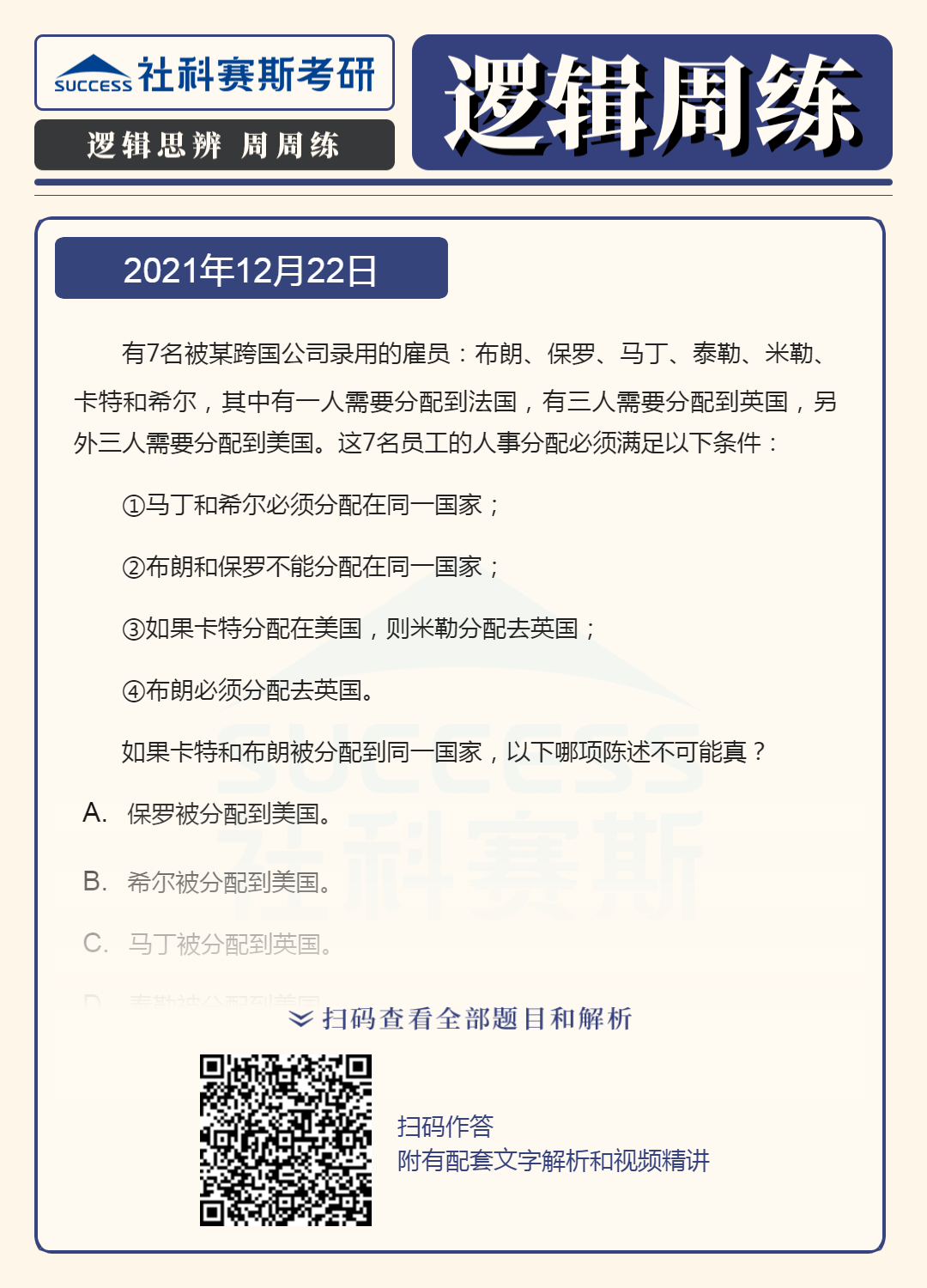 以上就是“2022MBA邏輯:2022MBA聯考邏輯習題及答案解析(12月22日)”的全部內容,更多邏輯精選習題,請持續關注社科賽斯MBA備考網!