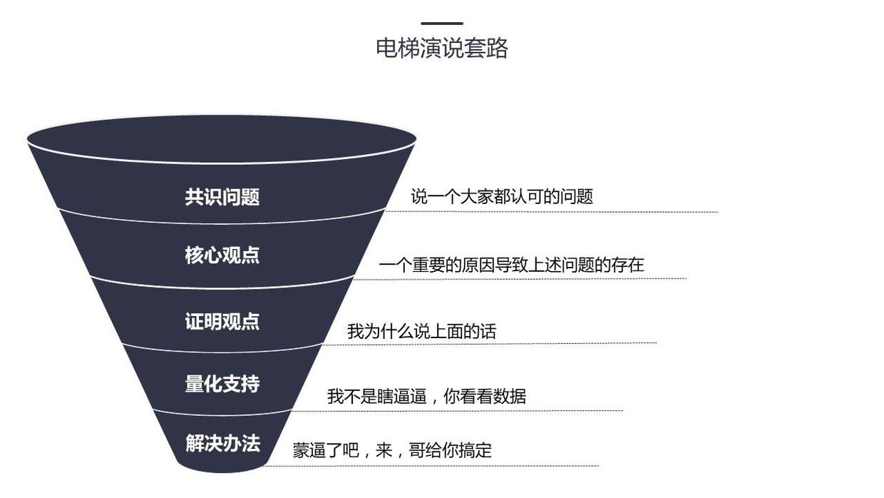 這個套路的本意就是:即使與別人在電梯間的短暫相遇,你也能清楚準確的表達觀點。