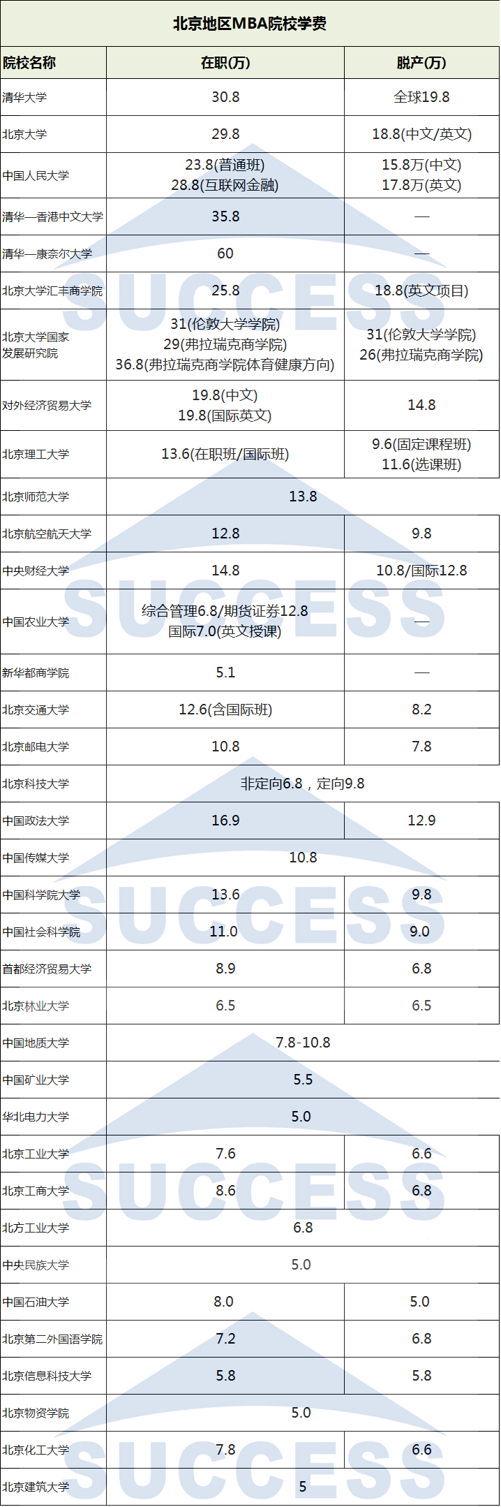 車型好、性價比高,你還有什么可考慮的? ... ... 各種都好,別再考慮了,趕緊拿下吧! 這些話我們都不陌生,買房買車買東西時都會聽到...我知道這房子好,升值快,但我買不起;奔馳寶馬是好,但我買不起。很簡單的問題,各種都好,你在考慮什么,考慮錢... 報考MBA的同學同樣有這樣的困擾,清華、北大是好,但以我現在的經濟基礎,學費太貴,我還讀不起,算啦,再過個幾年經濟好點再考~ 海淀房子買不起,你肯定會想到通州或燕郊,無論買哪,升值是一定的。類比MBA也是一樣,學歷或職業不如意,有讀MBA的需求,目標院校學費高,自己工作年限短,經濟條件達不到,何不先嘗試其他學費稍低,適合自己的院校,最終總歸是自己得到提升~ 所以,既然有讀MBA的需要,就別因為學費而放棄,找到適合自己經濟條件的院校先學習提升即可。之后經濟更寬裕,還有更進一步的需求,殺回名校讀個EMBA也是很好的選擇啊! 當然,對大家有幫助的院校資訊還是要送上的,小編整理北京地區院校MBA學費,有需要的同學們找到適合自己的并為之努力吧~ 各院校學費有可能隨時作出調整,本版信息為截止發稿時最新信息,如有調整以院校網站公布的最新信息為準。