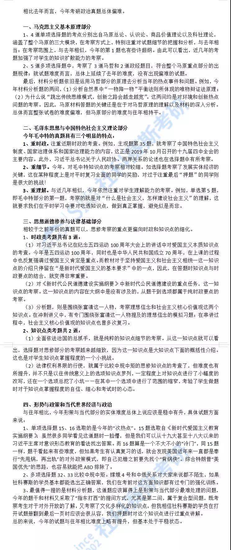 另外,政治老師們還對2020考研政治的真題進行了一個詳細分析,我們將內容進行了整理,希望大家能對2020考研政治真題有一個更深的了解!