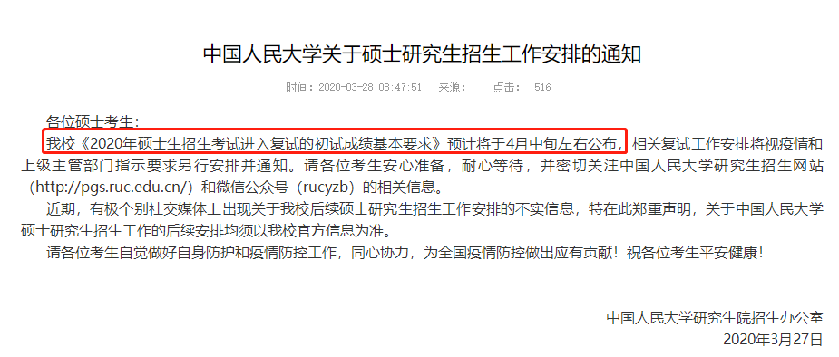 今日,中國(guó)人民大學(xué)官網(wǎng)發(fā)布通知:“《2020年碩士生招生考試進(jìn)入復(fù)試的初試成績(jī)基本要求》預(yù)計(jì)將于4月中旬左右公布”。