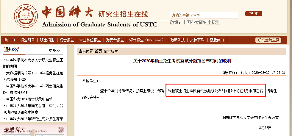 同時(shí),中國(guó)科學(xué)技術(shù)大學(xué)官網(wǎng)發(fā)布通知“我校碩士招生考試復(fù)試分?jǐn)?shù)線公布時(shí)間預(yù)計(jì)將在4月中旬左右”