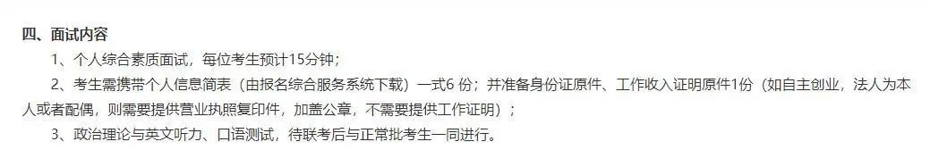 考生需攜帶個人信息簡表(由報名綜合服務系統下載)一式6 份;并準備身份證原件、工作收入證明原件1份(如自主創業,法人為本人或者配偶,則需要提供營業執照復印件,加蓋公章,不需要提供工作證明);
